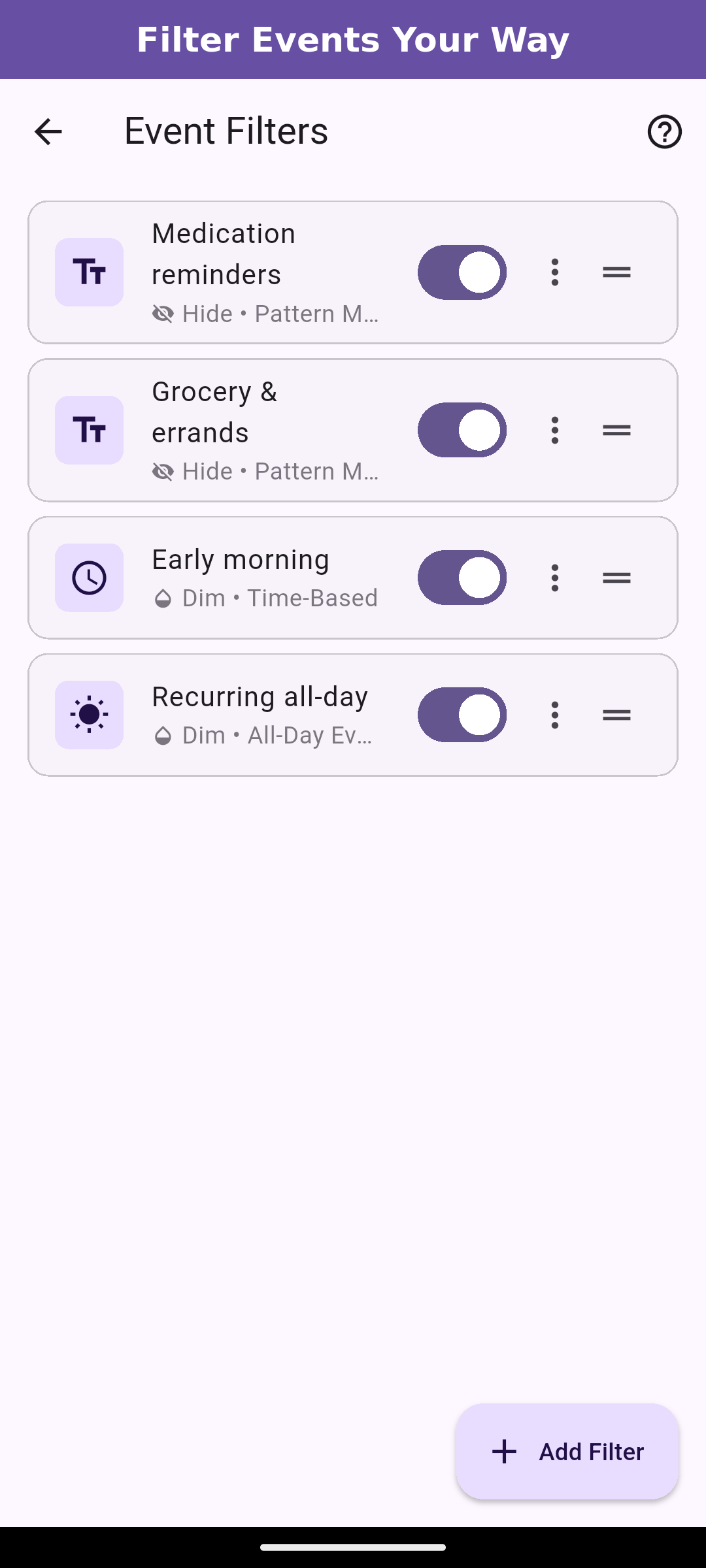Caffeinated Calendar lets you filter individual events without affecting anyone else. Long-press an event you don’t want to see, tap “Create Filter,” and it’s gone from your view. You can filter by keyword, time of day, or specific recurring events.